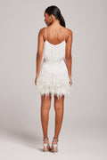 This glamorous mini is fully adorned with dazzling fringe and finished with delicate feather detailing at the hem, adding dramatic movement with every step.