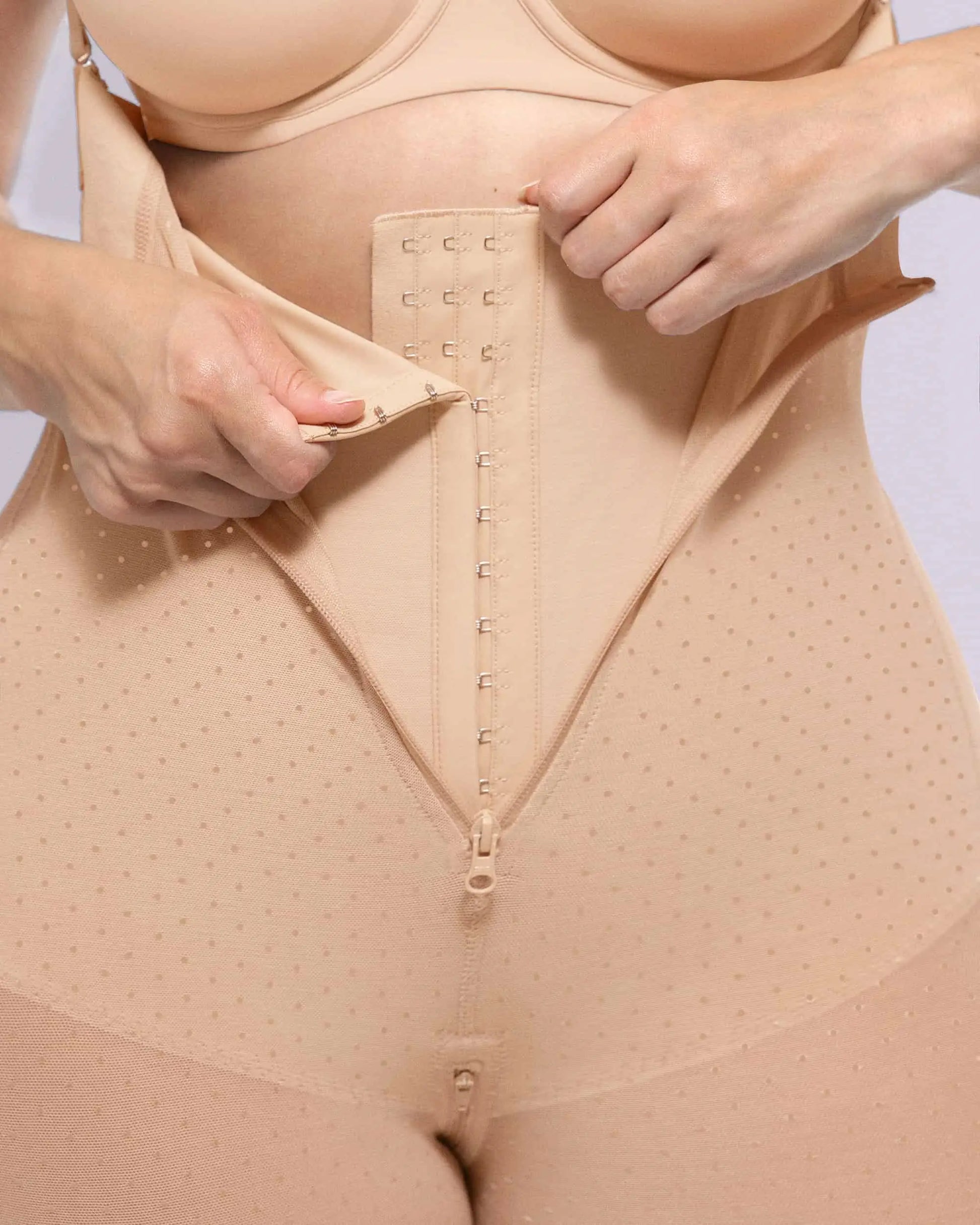 • Built-in waist cincher with adjustable hook-and-eye closure for optimal shaping.
