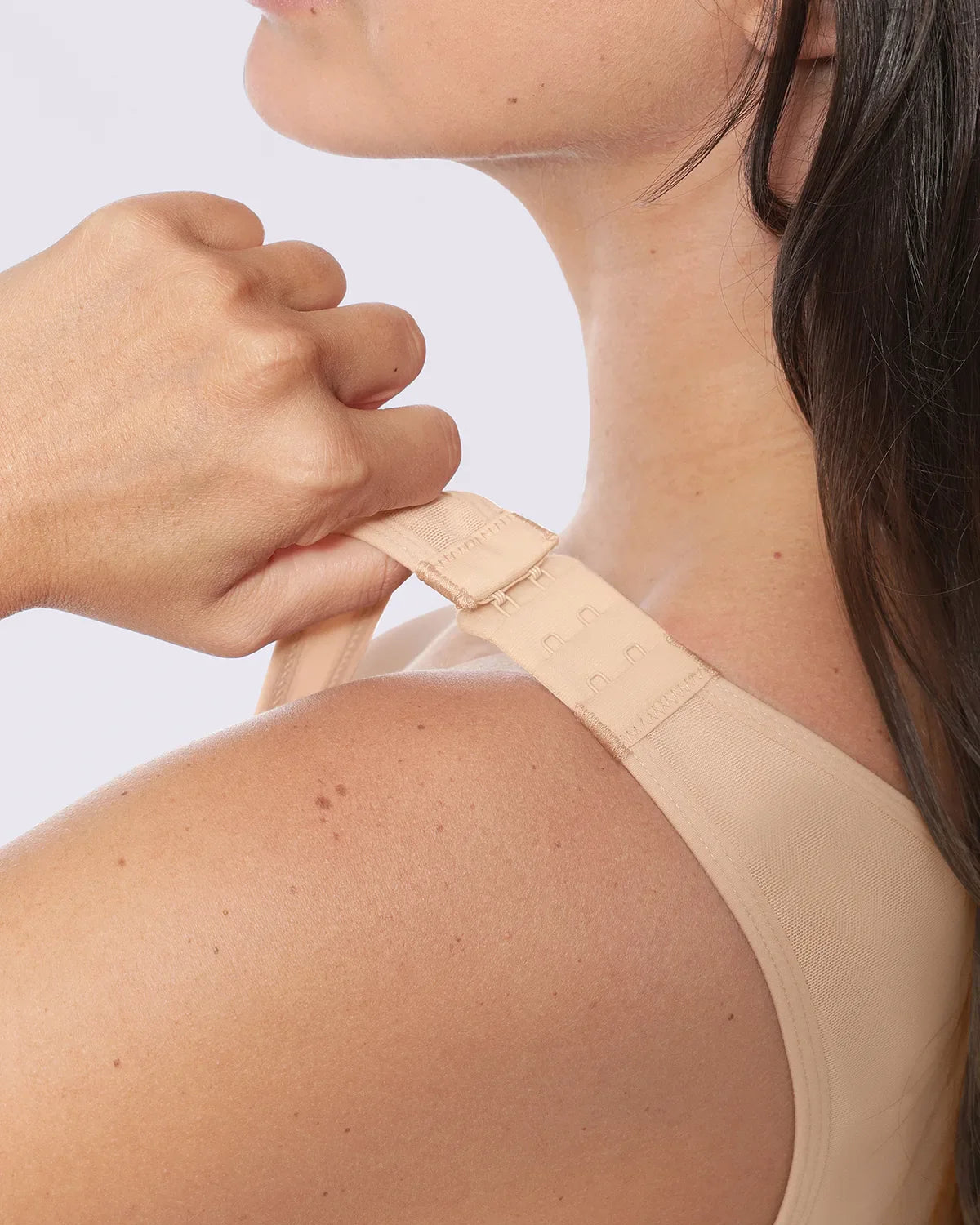 • U-shaped support lifts and centers breasts while smoothing underarm lines.
