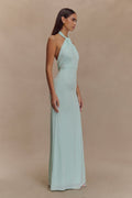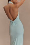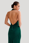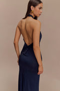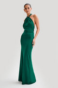 Its halter neckline and ruched centre front exude sophistication, while the low back adds a touch of sultry charm.
