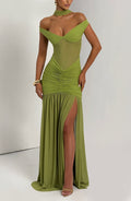 Its tightly ruched hips and dropped waist lead to a flowing full sheer skirt with a thigh-high split, crafted from mesh fabric for elegant movement.