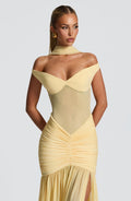 The Colette Maxi Dress in lemon features a sheer mesh bodice and a bardot neckline, complemented by an elasticated back strap for a perfect fit.