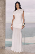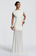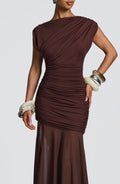 Elegant and effortlessly chic, the Courtney Maxi Dress features a soft modal jersey bodice with a high boat neckline, cross-body pleats on the bust, and flattering ruching through the torso.