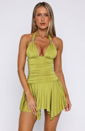 Crafted in a silky, stretch fabric that hugs the waist and flows into a playful asymmetric hem, this mini dress is a perfect mix of glam and comfort.