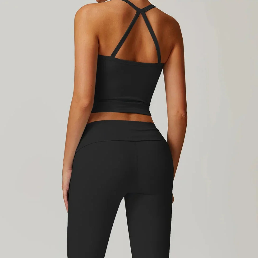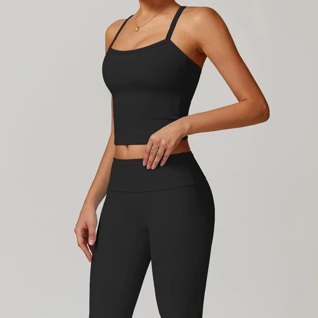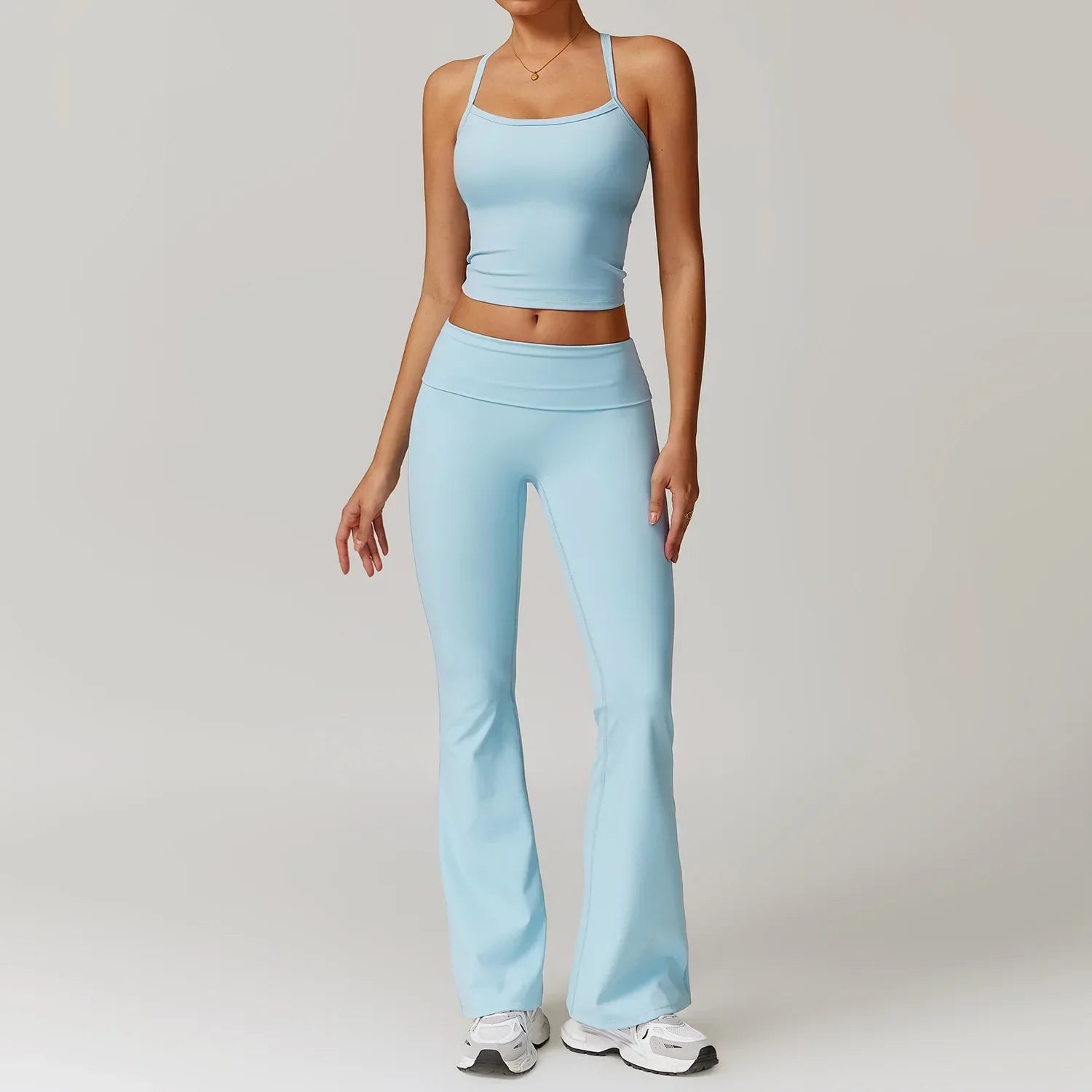 Cet ensemble deux pièces allie un look minimaliste à une coupe flatteuse, idéale pour vos séances de sport ou vos moments de détente. Le pantalon évasé et le haut à fines bretelles assurent un maintien optimal tout en mettant en valeur la silhouette.