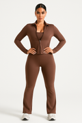 Ensemble marron profond avec veste zippée et legging gainant. Matière stretch et douce au toucher, idéal pour un look fort et raffiné.
