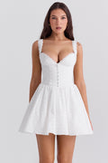 Veronica has a corseted bodice for a cinched waist and a plunging shaped bust for gentle support. The delicate button detailing and flouncy mini skirt adds to the girlish feel, especially the soft tulle underskirt.